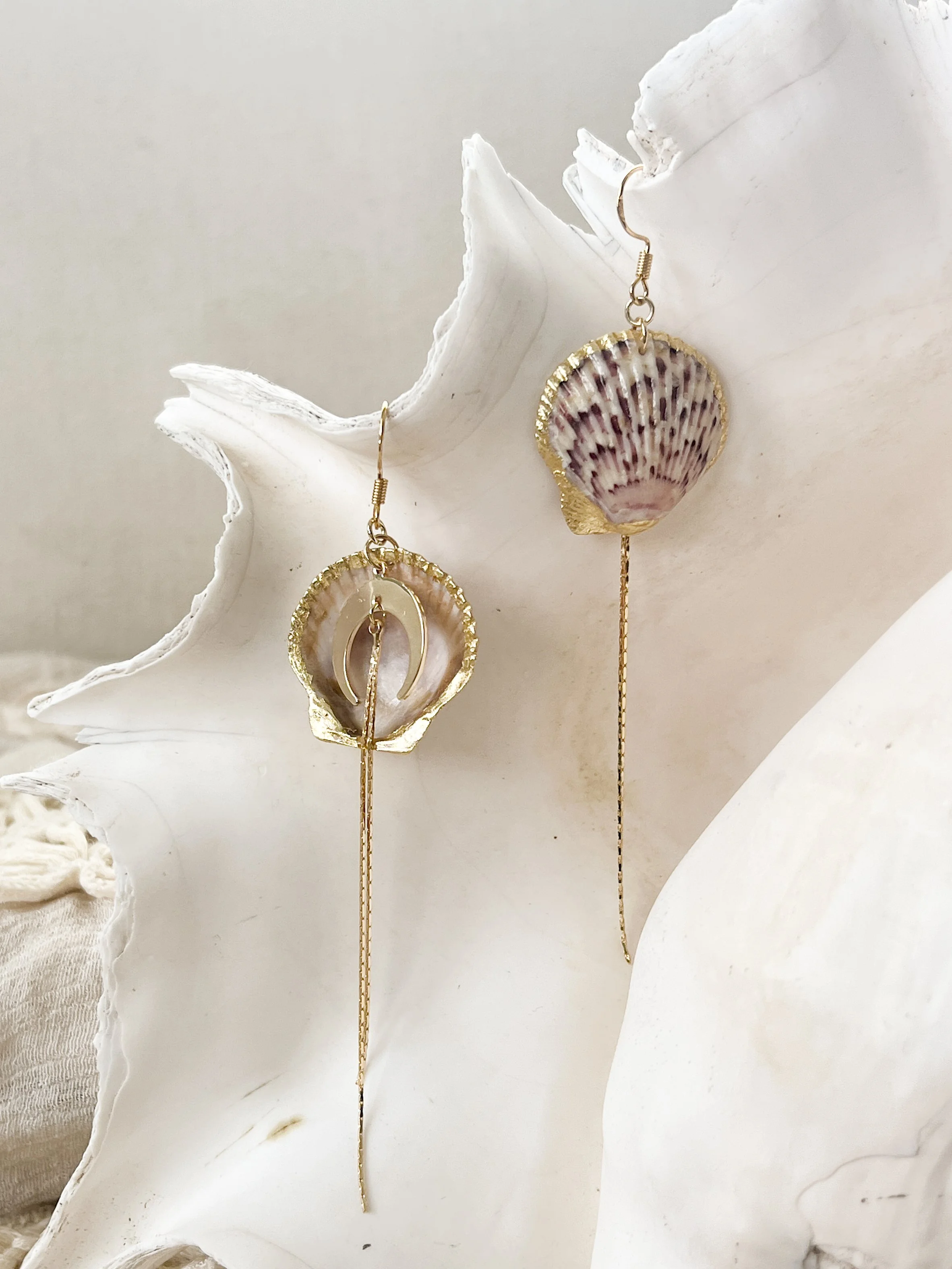 A golden moon rests behind each shell, calling you to remember who you are. Golden tassels flow gently from the moon, reflecting your alignment and attunement to the divine.